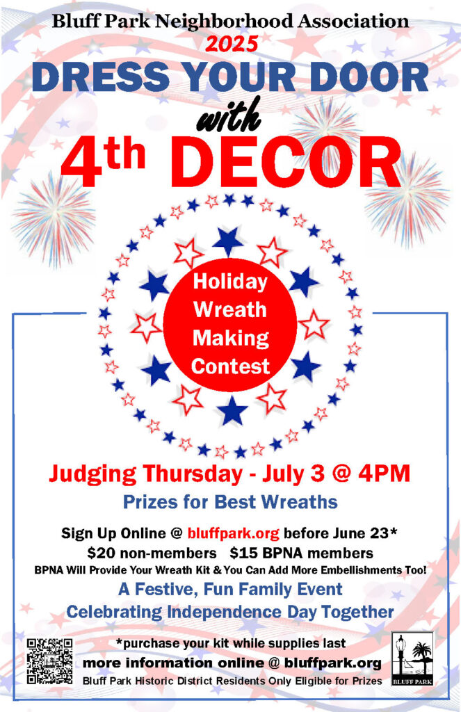 * NOTE: You can participate from anywhere nearby; however, the judging and contest winners will be awarded only from among those who live and display in the Bluff Park Historic District. Eligible wreath entries must be readily visible from the street and must be newly made using the 2025 BPNA-provided kit. Sorry, past years’ entries are not eligible.